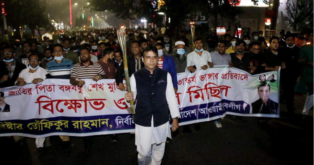 বঙ্গবন্ধুর ভাস্কর্য ভাঙার প্রতিবাদে মশাল হাতে ব্যারিস্টার তৌফিকুর রাহমান