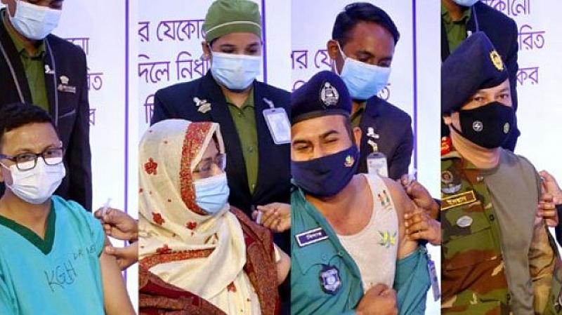 করোনা টিকা গ্রহণকারী প্রথম পাঁচজন হলেন নার্স রুনু ভেরোনিকা কোস্তা, চিকিৎসক ডা. আহমেদ লুৎফুল মোবেন, স্বাস্থ্য অধিদপ্তরের অতিরিক্ত মহাপরিচালক অধ্যাপক ডা. নাসিমা সুলতানা, ট্রাফিক পুলিশ মো. দিদারুল ইসলাম ও বাংলাদেশ সেনাবাহিনীর বিগ্রেডিয়ার জেনারেল এম ইমরান হামিদ।