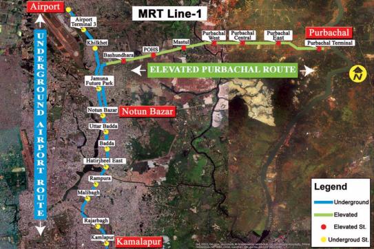বিমানবন্দর থেকে কমলাপুর রেলওয়ে স্টেশন পর্যন্ত হচ্ছে দেশের প্রথম পাতাল রেলপথ। ম্যাস র্যাপিড ট্রানজিট লাইন-১ বা এমআরটি লাইন-১ নামে পরিচিত এই প্রকল্পের কাজ শেষ হলে বিমানবন্দর থেকে কমলাপুরে যেতে সময় লাগবে ২৪ মিনিট ৩০ সেকেন্ড। ১৯ দশমিক ৮৭ কিলোমিটার পথে থাকবে ১২টি স্টেশন।