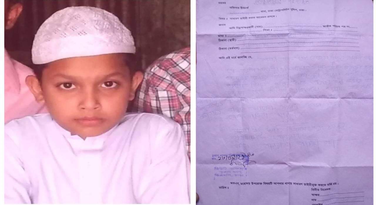 ১২ ই সেপ্টেম্বর রবিবার বিকেল আনুমানিক ৫ টার দিকে দলিপাড়া মীম জীম হিফজুল কুরআন মাদ্রাসা থেকে নিখোঁজ হয়।