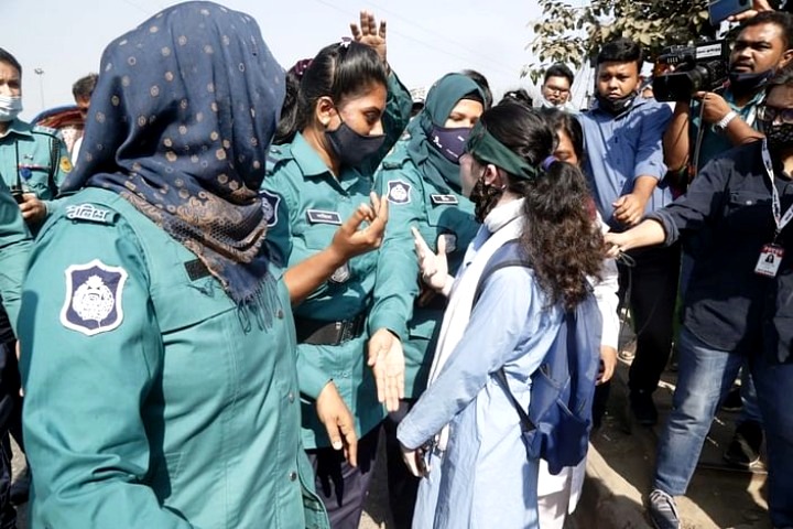 দুপুর ১২টায় রামপুরা ব্রিজের ওপর দাঁড়াতে গেলে পুলিশ শিক্ষার্থীদের সরিয়ে দেয়। এ সময় কয়েকজন শিক্ষার্থী পুলিশের বাধা উপেক্ষা করে দাঁড়াতে গেলে নারী পুলিশ সদস্যদের সঙ্গে তাদের ধাক্কাধাক্কি হয়। দু’জন শিক্ষার্থীকে ব্রিজ থেকে সরিয়ে বনশ্রী সড়কে নামিয়ে দেয় পুলিশ। পরে সেখানেই তারা দাঁড়িয়ে প্রতিবাদ করেন।