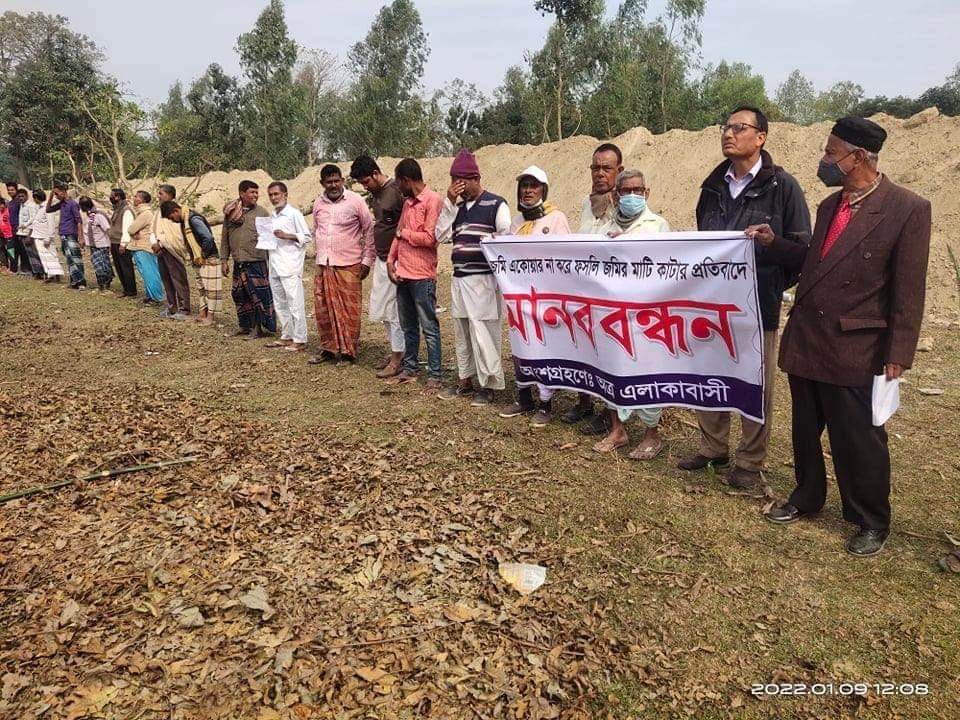 মানববন্ধনে বক্তারা বলেন, উপজেলার পাটিচোড়া থেকো পলিপাড়া পর্যন্ত ১৮ কিলোমিটার বাঁধ ৫ ফুট উচু করে সংস্কারের কাজ শুরু হয়েছে। এই সংস্কারের কাজ করতে বাঁধের আশপাশের ফসলি জমির মাটি কাটা হচ্ছে। এ বিষয়ে স্থানীয় কৃষকদেরকে কিছুই জানানো হয় নি। কৃষকদের দাবী বাঁধ সংস্কারের কাজে ফসলি জমির যে মাটি কাটা হচ্ছে তা একোয়ার করার। তারা জমি একোয়ার না করে তাদের জমির মাটি কাটতে দিবেননা বলেও মানববন্ধনে ঘোষনা দেন।