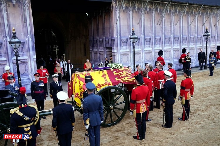 Lying on a gun carriage, covered by the Royal Standard flag and with the Imperial State Crown placed on a cushion on top alongside a wreath of flowers, the coffin bearing Elizabeth’s body was taken in a slow, somber procession from her London home to Westminster Hall. There it will lie in state for four days.