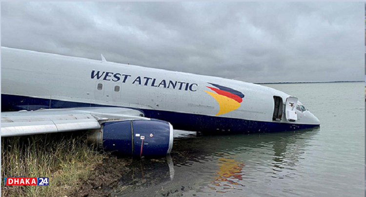 Images showed the Boeing 737 of the West Atlantic cargo carrier tilting with its nose in the lake and body perched on the land. The three crew escaped the accident in the early hours of Saturday unhurt, local authorities said.