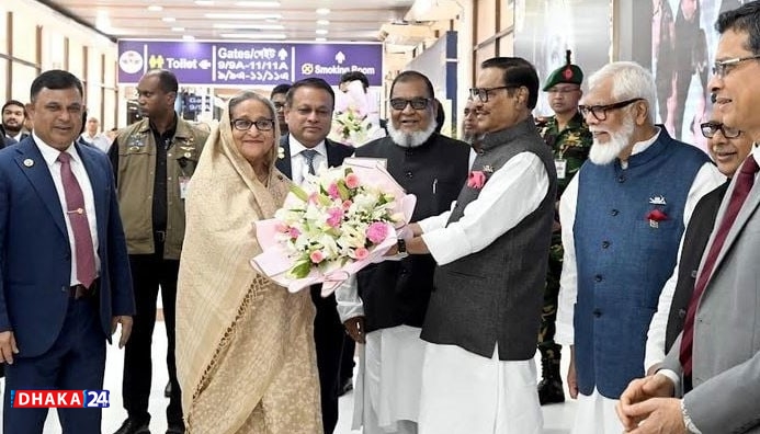 A commercial flight (BG-208) of the Biman Bangladesh Airlines carrying the prime minister and her entourage members landed at the Hazrat Shahjalal International Airport at 12:15 pm.