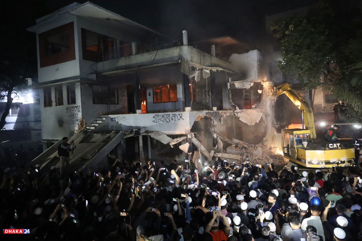 পরে বুলডোজার ও ক্রেন দিয়ে বাড়িটি ভাঙা শুরু হয়। রাত সোয়া ৯টার দিকে ভবনের দোতলায় অগ্নিসংযোগ করা হয়। পরে রাত সাড়ে ১০টার দিকে একটি ক্রেন বাড়ির সামনে নিয়ে যাওয়া হয়। রাত সাড়ে ১১টার দিকে গেট দিয়ে বাড়ি ভাঙতে ভাঙতে ক্রেনটি ভেতরে প্রবেশ করে। এ সময় উৎসুক জনতাকে ক্রেনের ওপর উঠে উল্লাস করতে দেখা গেছে। ‘শেখ মুজিবের বাড়ি ভেঙে দাও, গুঁড়িয়ে দাও’ বলে স্লোগান দিতে দেখা গেছে ছাত্রদের।