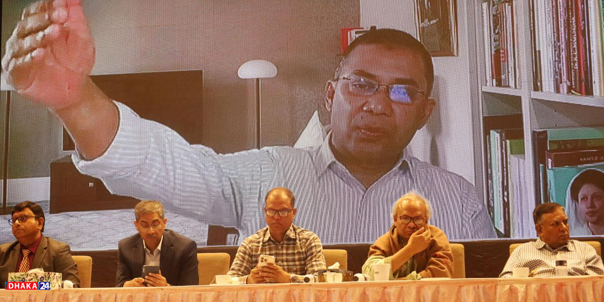 মতবিনিময় সভায় ভার্চুয়ালি বক্তব্য রাখেন বিএনপির ভারপ্রাপ্ত চেয়ারম্যান তারেক রহমান। ছবি: খবরের কাগজ