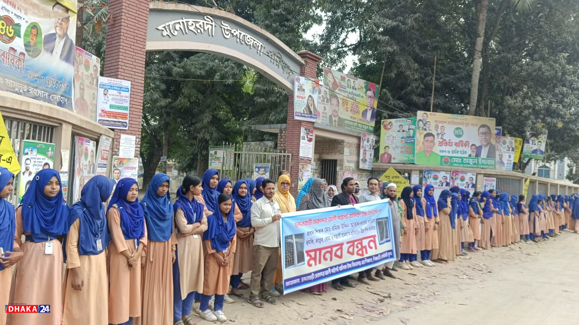 নরসিংদীর মনোহরদীতে চন্দবাড়ী এস এ পাইলট বালিকা উচ্চ বিদ্যালয়ের গভর্নিং বডির সভাপতি পদে নাম প্রস্তাবের দাবীতে প্রধান শিক্ষকের গ্রামের বাড়ীতে তিনদফা হামলা ও ভাংচুরের ঘটনা ঘটেছে। এ ঘটনার প্রতিবাদ ও বিচারের দাবীতে আজ বিকেলে বৃহস্পতিবার উপজেলা পরিষদের সামনে ওই শিক্ষা প্রতিষ্ঠানের শিক্ষক-শিক্ষার্থী ও কর্মচারীদের পক্ষ থেকে মানববন্ধন করা হয়েছে।