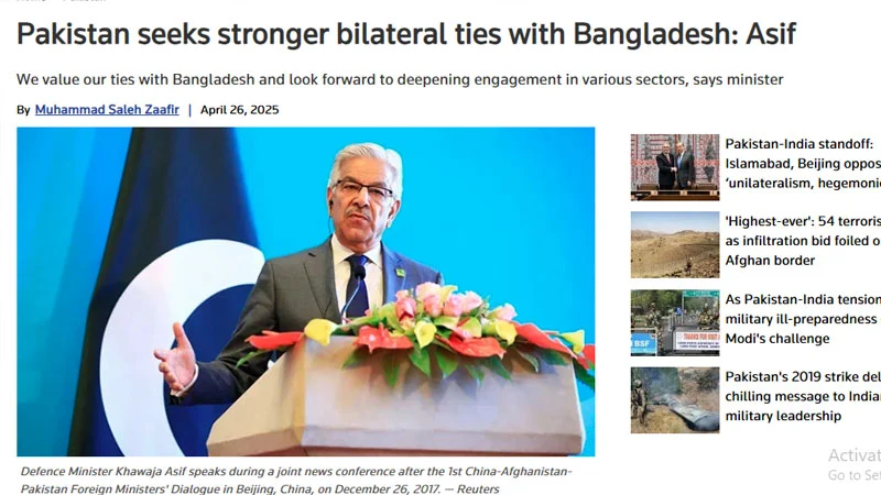 সংবাদমাধ্যমটি বলছে, বাংলাদেশের ৫৪তম জাতীয় ও স্বাধীনতা দিবস উপলক্ষে আয়োজিত এক সংবর্ধনা অনুষ্ঠানে প্রধান অতিথি হিসেবে বক্তব্য রাখার সময় প্রতিরক্ষামন্ত্রী খাজা মুহাম্মদ আসিফ এসব কথা বলেন।